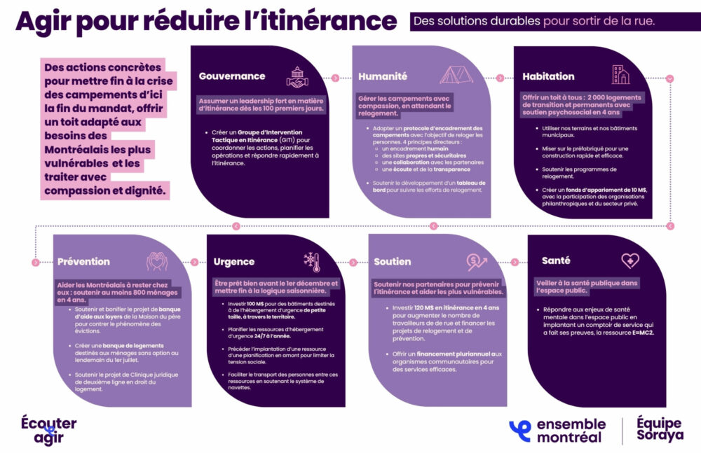 Une administration dirigée sous Soraya Martinez Ferrada mettra en place un Groupe d’intervention tactique en matière d’itinérance (GITI) pour coordonner les interventions de terrains et planifier les opérations à venir, ainsi qu’un protocole d’encadrement des campements, en collaboration avec les organismes communautaires et les services de la Ville.