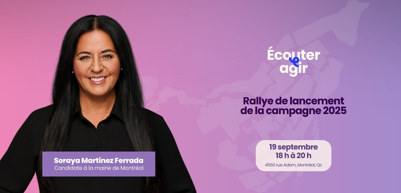 Joignez-vous à nous pour le Grand Rallye de début de campagne électorale 2025 d’Ensemble Montréal avec notre cheffe et candidate à la mairie, Soraya Martinez Ferrada, un mouvement qui commence par écouter et qui passe à l’action pour bâtir un Montréal meilleur.